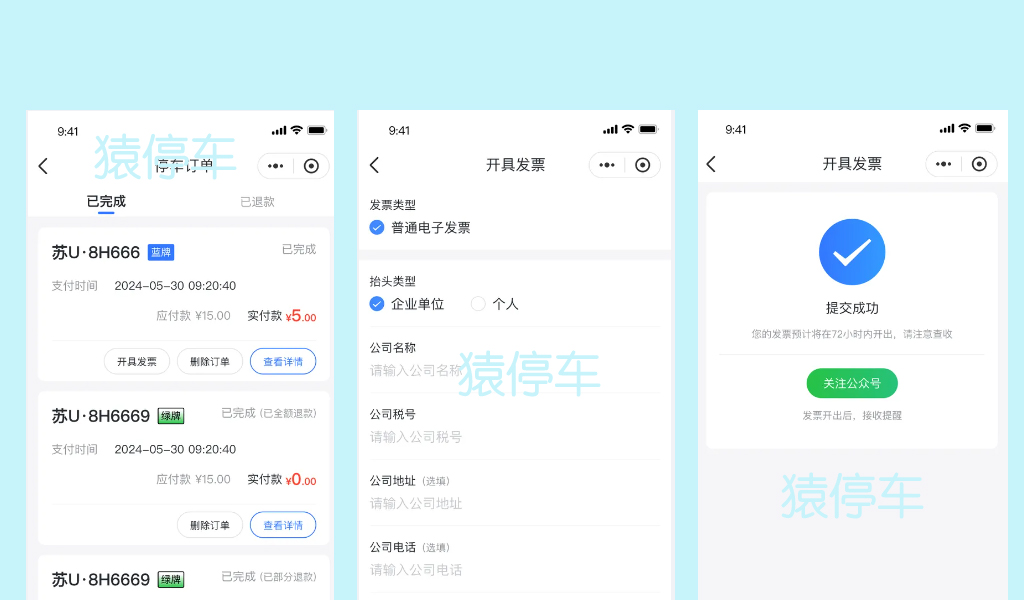 3. 开具停车发票:已缴订单一键申请开具发票。